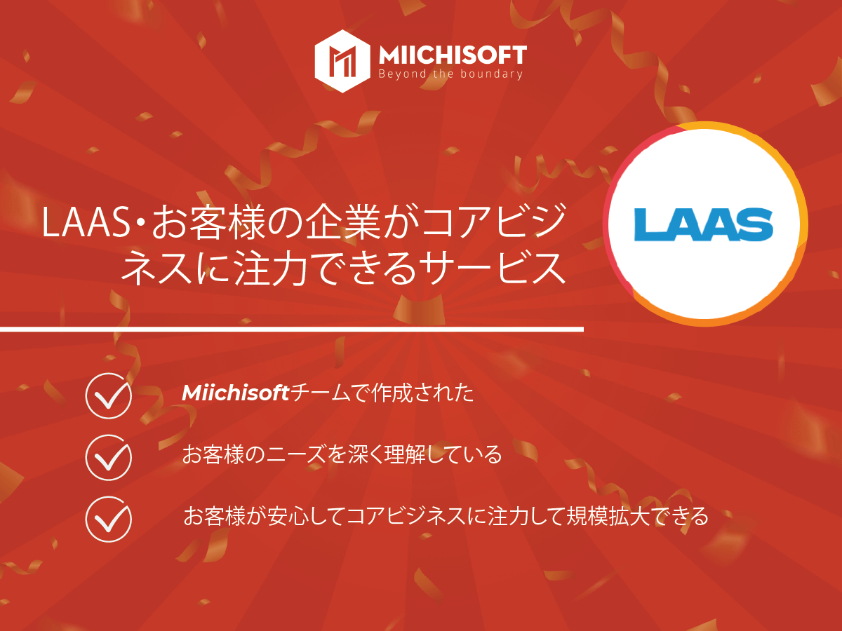 LAAS とはLabol as a serviceの省略で Miichisoft チームで作成されました。中小企業から大手企業のお客様と数年間取引した経験によりお客様のニーズを深い理解しました。そのためITのソリューションのみならずお客様が安心してコアビジネスに注力、規模拡大できる環境も提供したいです。